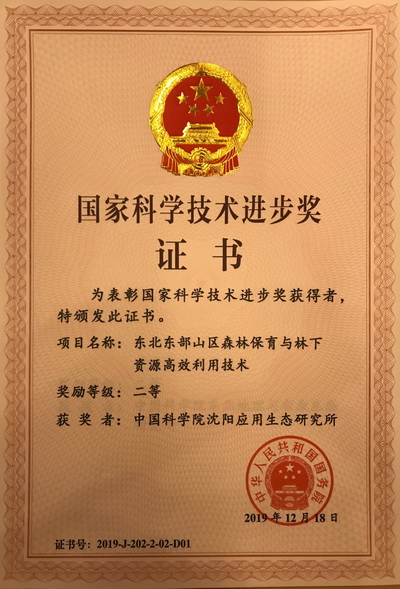 2020年1月10日,2019年度国家科学技术奖励大会在北京人民大会堂举行。中国科学院沈阳应用生态研究所作为第一完成单位的项目"东北东部山区森林保育与林下资源高效利用技术"荣获2019年度国家科技进步二等奖。