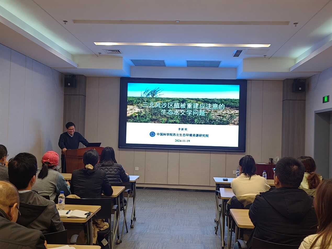 报告内容深入浅出,引人入胜,不仅为参会者展示了沙区生态水文领域的前沿进展,还启发了科研人员对固沙植被重建与恢复中的生态水文原理的深层思考。精彩的报告引起与会师生的浓厚兴趣,会场气氛热烈。报告结束后,李新荣研究员与参会师生进行了深入交流和讨论。