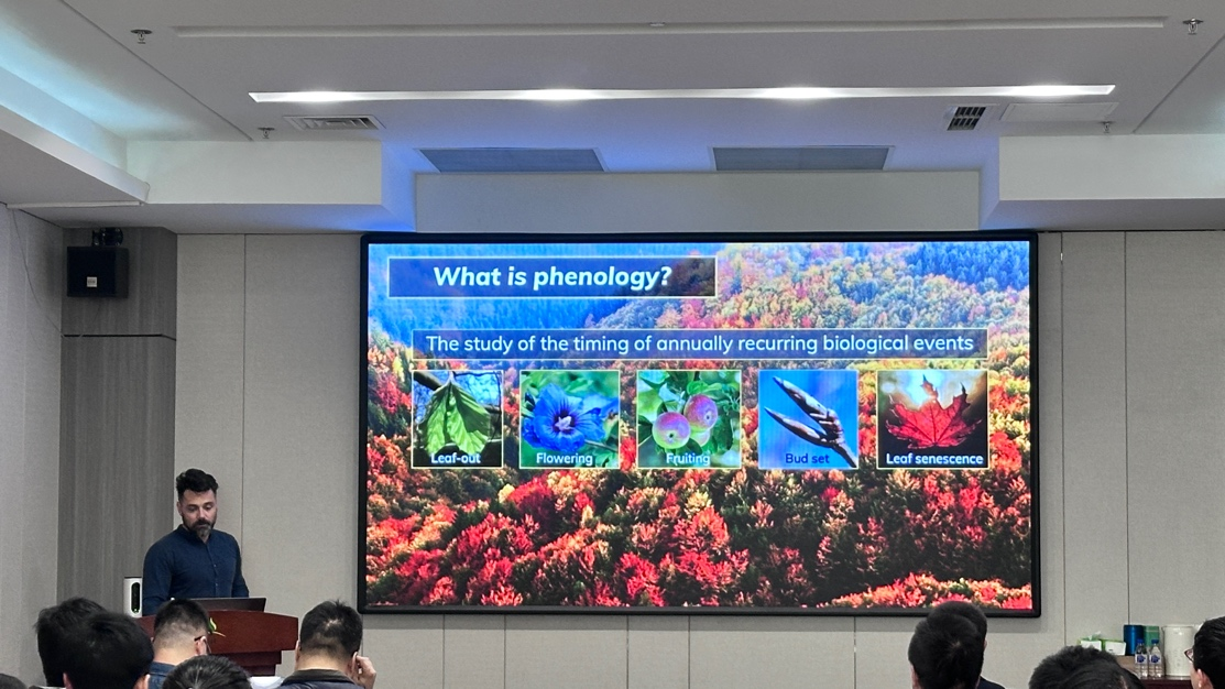 4月7日Constantin Mario Zohner教授以“Understanding Changes in the Drivers of Spring Phenology Over Recent Decades”为题,系统介绍了近年来气候变化下春季植物物候的演变趋势。重点分析了温度、光周期和降水等主要环境因子对物候驱动的相对作用,并讨论了它们在不同区域和物种中的差异性效应。同时,Constantin教授探讨了植物应对气候变化的物候响应机制,包括冬季休眠释放与春季热量积累的相互作用,以及光周期在避免春霜风险中的调节作用。最后,他阐明了物候变化对生态系统功能的影响,以及植物物候对气候系统的反馈,以及如通过生物挥发性有机化合物排放和碳循环过程调节大气成分的潜在机制,为大家理解全球变化下的生态–气候互作提供了新视角,引起大家的广泛兴趣。