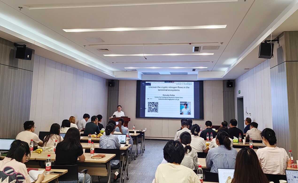 Keisuke Koba教授于9月3日上午进行了学术报告,我室方运霆研究员、康荣华研究员、吴迪研究员及所内其他青年科研人员、在读研究生等60余人参加本次学术研讨会。他以“Uncover the cryptic nitrogen flows in the terrestrial ecosystems”为题,基于氮氧稳定同位素自然丰度技术,对日本的森林生态系统进行了深入研究,详细解析了森林生态系统中的氮循环过程,及其对气候、生物地球化学与自然环境之间复杂相互作用的响应,激发了参会者的热烈讨论。此外,天津大学刘学炎团队、中国科学院亚热带农业生态研究所李德军团队、中国科学院华南植物园的鲁显楷团队和郑棉海团队成员,共做15场学术报告,涵盖森林生态、土壤微生物和生物多样性等多个研究方向。这些报告不仅展示了他们的研究成果,也为参会者提供了良好的交流平台,促进了不同学科之间的交流合作。