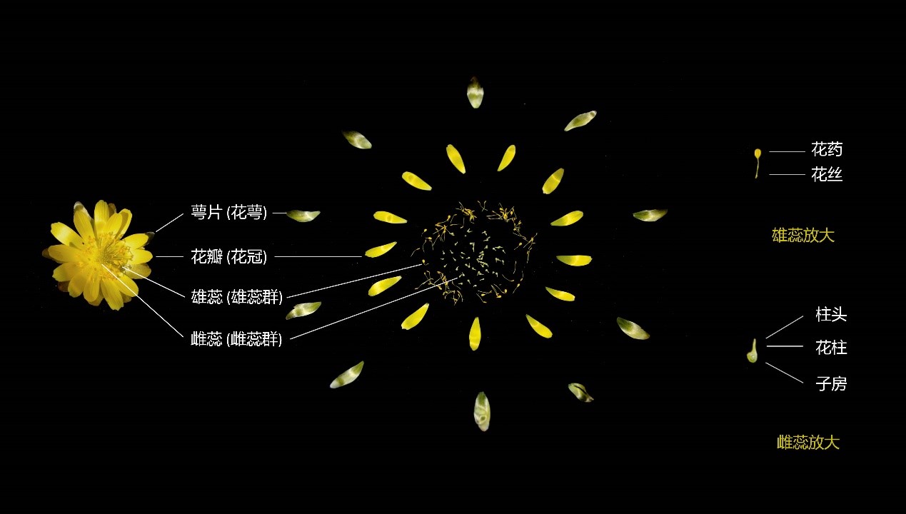 这一周里,侧金盏花雌雄蕊的出行时间井然有序。第一天,雌蕊先出行(成熟),突起在整朵花之上,花柱弯曲,柱头分泌粘液,而雄蕊乖乖地平躺在花瓣上,花丝较短,花药不开裂;等到第二天,雄蕊才开始出行(成熟),花丝伸长,逐渐直立向雌蕊靠拢,花药开裂散出花粉。这种雌雄蕊错峰出行的现象,被称为“雌雄异熟”,为侧金盏花异花传粉制造了机会。