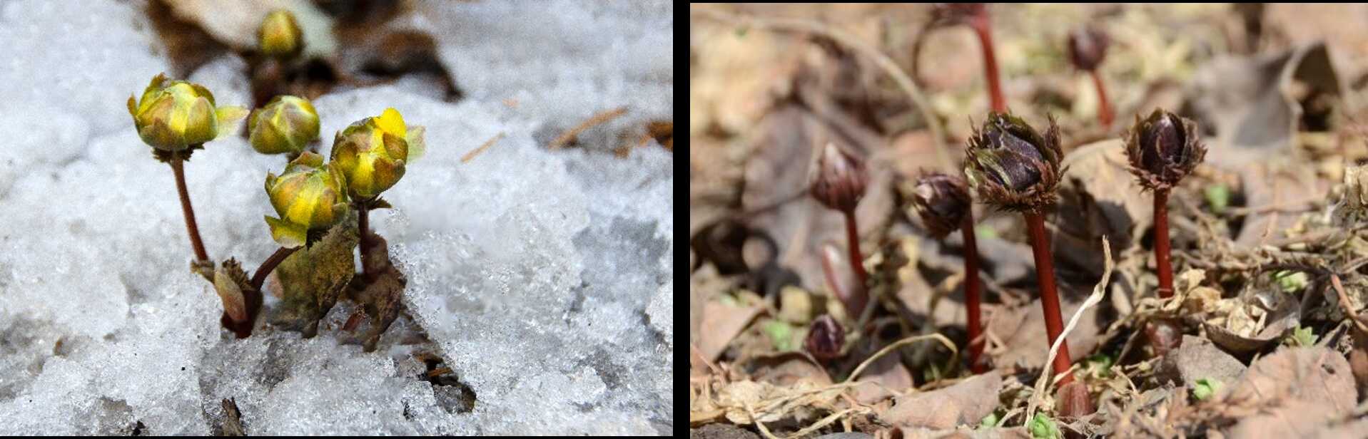 在花蕾期,侧金盏花的花苞是紫褐色,叶子很小,开花后才会慢慢长大(先花后叶);而辽吉侧金盏花的花苞深紫色,周围有一圈紫色的小叶子,会跟着花苞一起长大(花叶同放)。