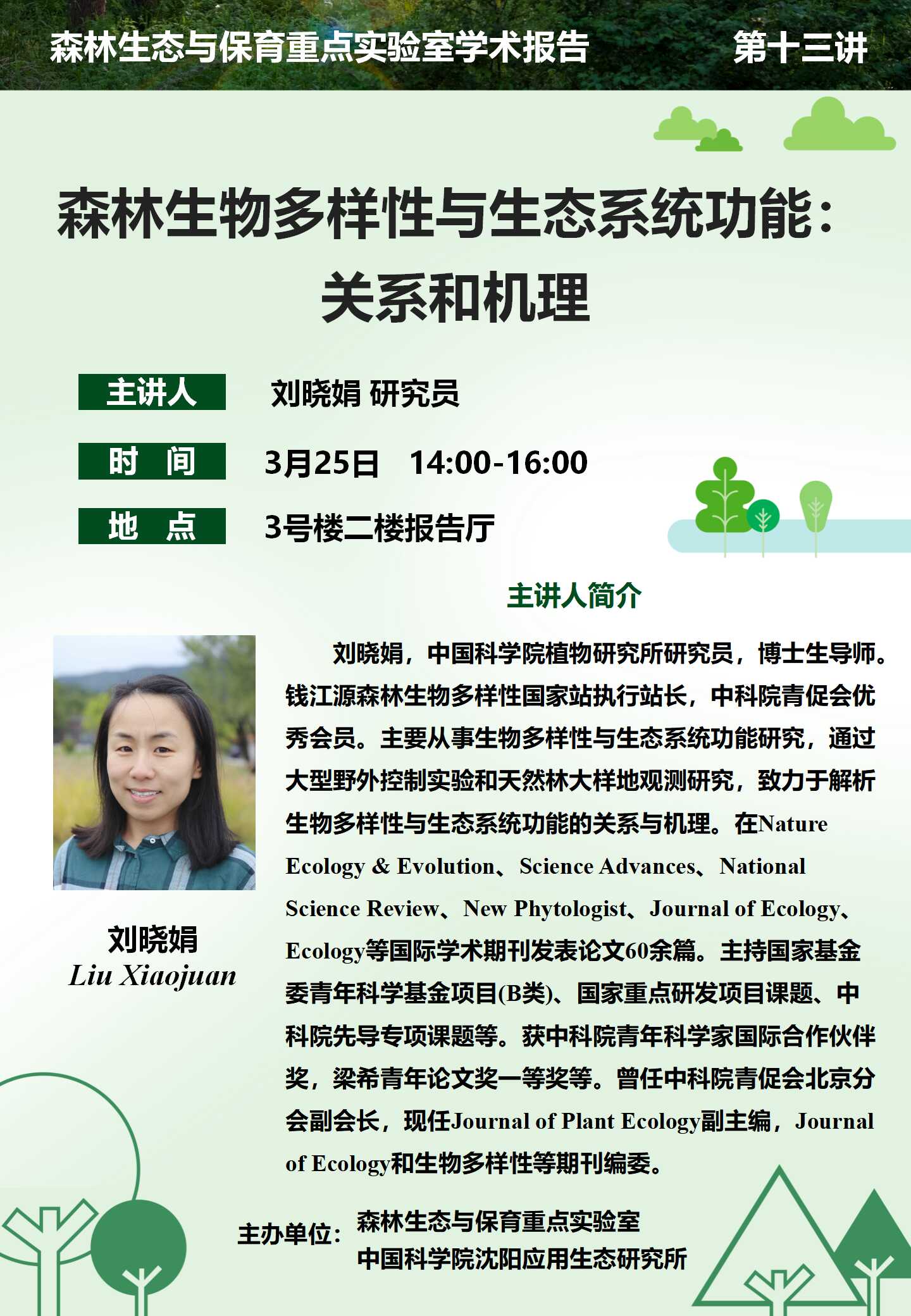 森林生态与保育重点实验室邀请中国科学院植物研究所刘晓娟研究员做报告,欢迎广大科研工作人员及研究生积极参与!