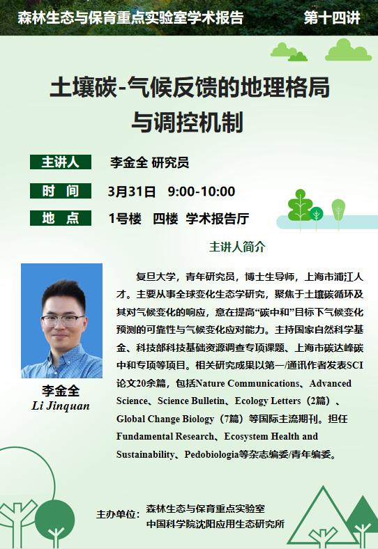 森林生态与保育重点实验室邀请复旦大学李金全研究员做报告,欢迎广大科研工作人员及研究生积极参与!