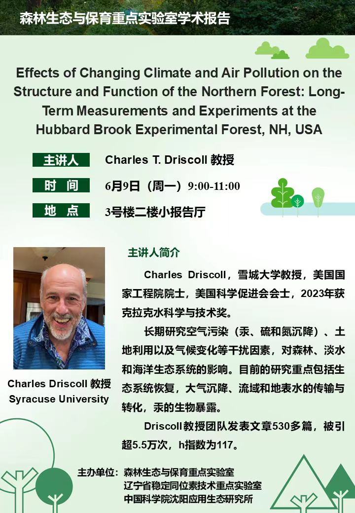森林生态与保育重点实验室邀请雪城大学教授、美国国家工程院院士Charles Driscoll做报告,欢迎广大科研工作人员及研究生积极参与!