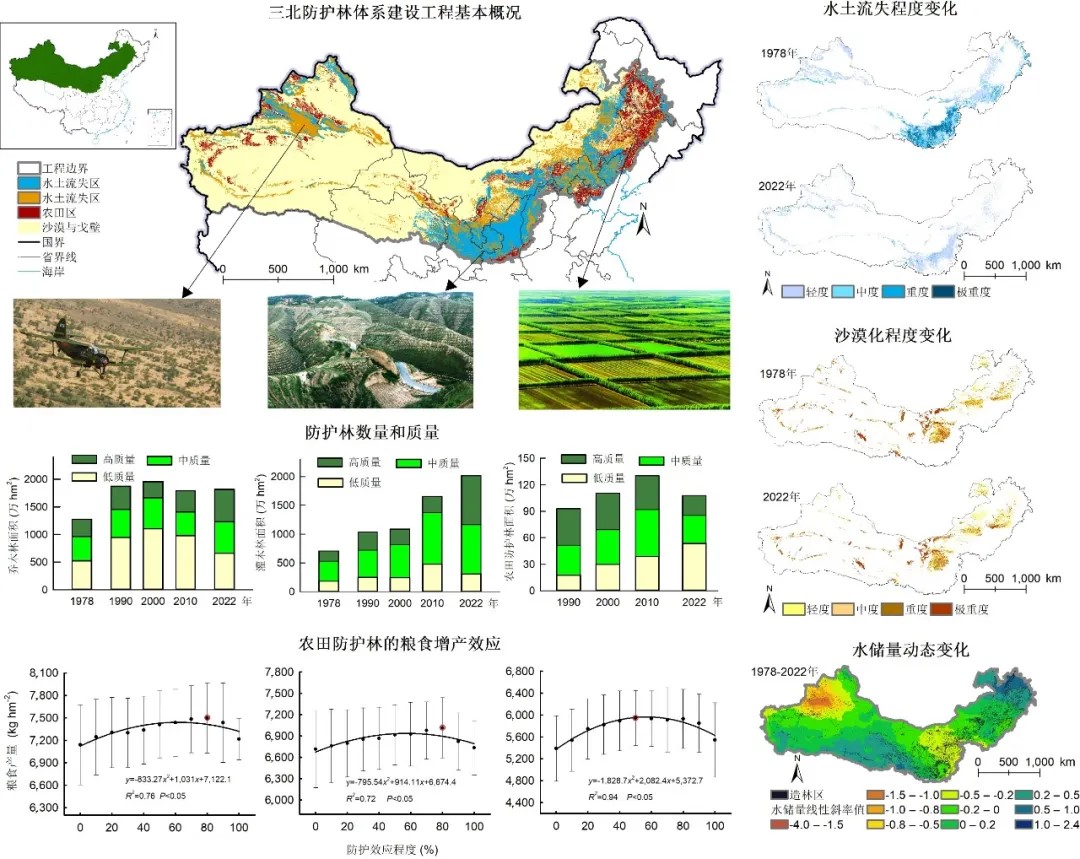 三北工程基本概况、防护林数量与质量、粮食增产效应、水土流失与沙漠化程度变化、水储量变化