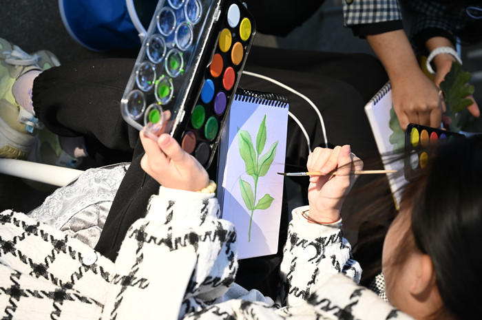 此外,活动邀请了专业美术老师,将博物学与美育相结合,让孩子们通过绘制树叶、果实的结构和颜色,亲身体验自然笔记的手绘。孩子们用心实践,认真听取老师关于绘画技巧、观察技巧的知识,并进行了分组创作。