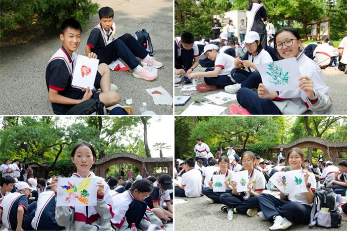 讲解结束后,闻华老师带领学生们进行植物拓染实验。大家亲自动手,感受不同植物叶片脉络的区别与美丽,领略植物和自然的神奇,用颜料和叶子绘制出自己心中的锦绣画卷。