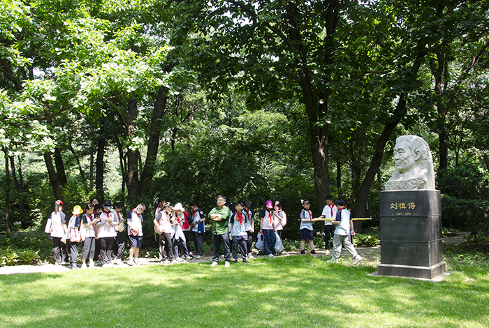 树木园黄彦青高级工程师向小朋友们耐心讲述了树木园的发展历史、重要功能以及未来的发展方向。随后,黄彦青老师和闻华老师分别带队,带领小朋友们认识园内植物,如东北红豆杉、人参、刺槐、杜仲等,介绍它们的药用价值和研究历史,并科普相关的植物学知识。黄老师向小朋友们讲述树木园创始人的生平事迹,带领他们在纪念广场静静感受老一辈科学家精神的传承和延续;闻老师带领小朋友们抚摸树化石,感受植物漫长的生命,并讲述其中蕴含的古老的地质、生物和气候信息。