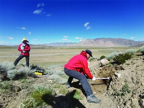 科研人员在考察土壤