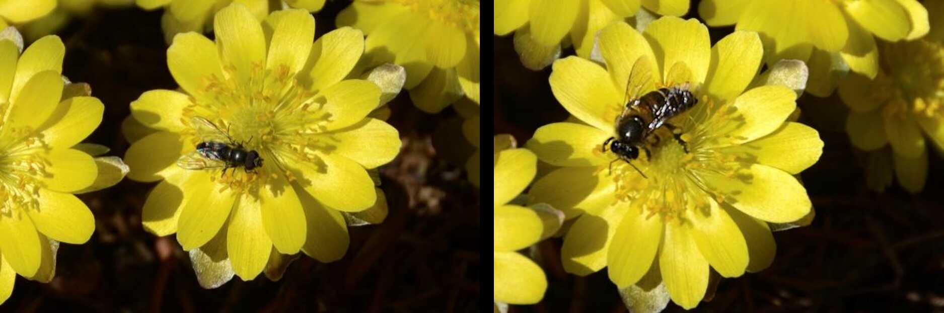 侧金盏花的访花昆虫食蚜蝇(左)与蜜蜂(右)