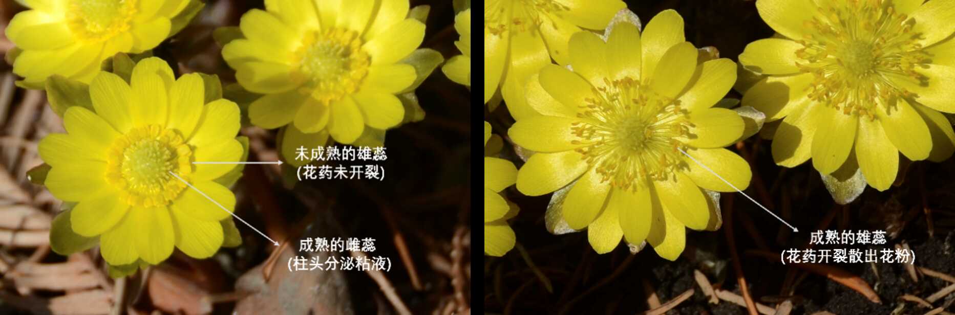 雌蕊先熟(左)与雄蕊开始成熟(右)