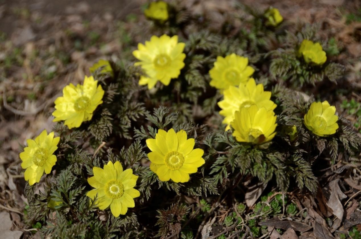 三月伊始,冰雪消融。北方的冬天刚刚过去,树木还没来得及换上新装。在园中闲逛的时候,突然发现地面长出了三朵黄色的小花。凑近一看,嚯,不知道什么时候开始,落叶中已经多了好些紫褐色的小脑袋,鼓鼓的,好像在为盛放积蓄着力量。这三朵明显是“好好学生”,已经率先露出了黄澄澄的花心。它们,就是早春植物——侧金盏花 (Adonis amurensis Regel et Radde)!