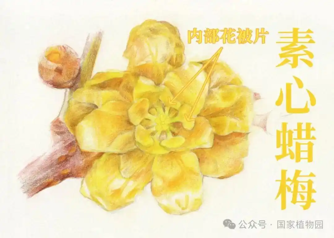 素心蜡梅:蜡梅中的名贵品种,素心指内部花被片均为黄色或淡黄色,开花时花瓣反卷,香味浓郁。