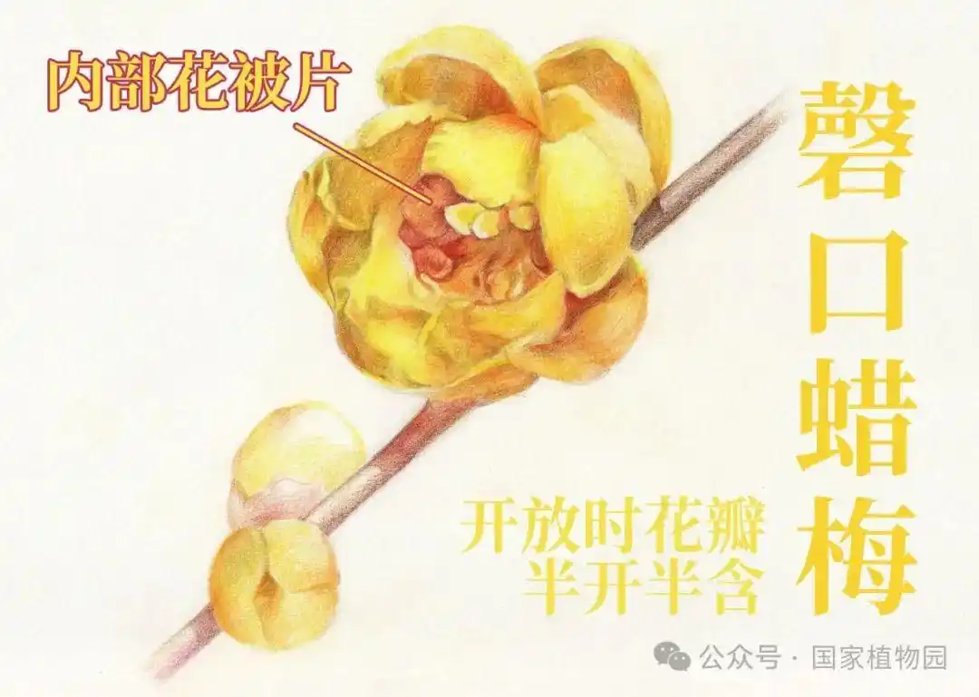 磬口蜡梅:又名“罄口”蜡梅,花朵形似钟磬,盛开时花瓣半开半含,内轮花被带有紫红色边缘和条纹,香气清溢。