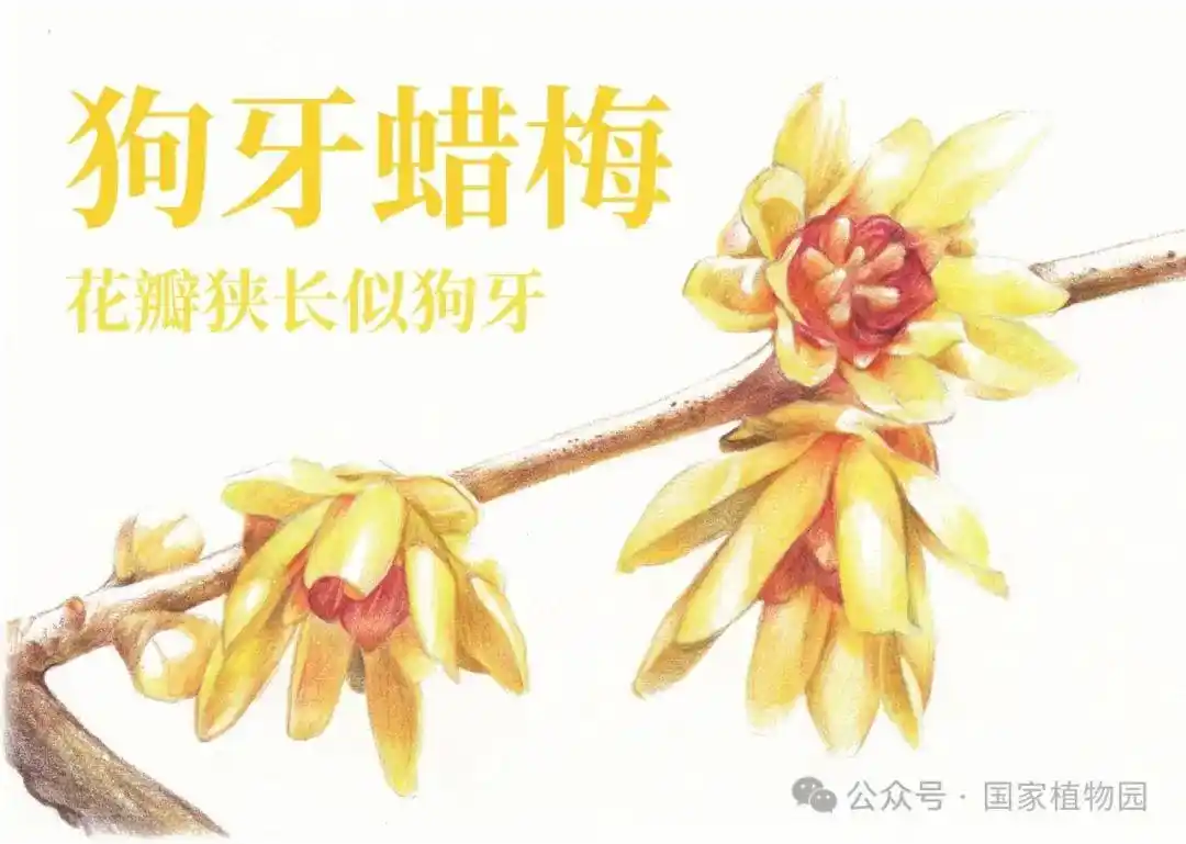 狗牙蜡梅,顾名思义花瓣狭长形似狗牙,先叶开放,花被片蜡质黄色,内层有紫晕,雄蕊5-6,花托边缘有不育雌蕊。