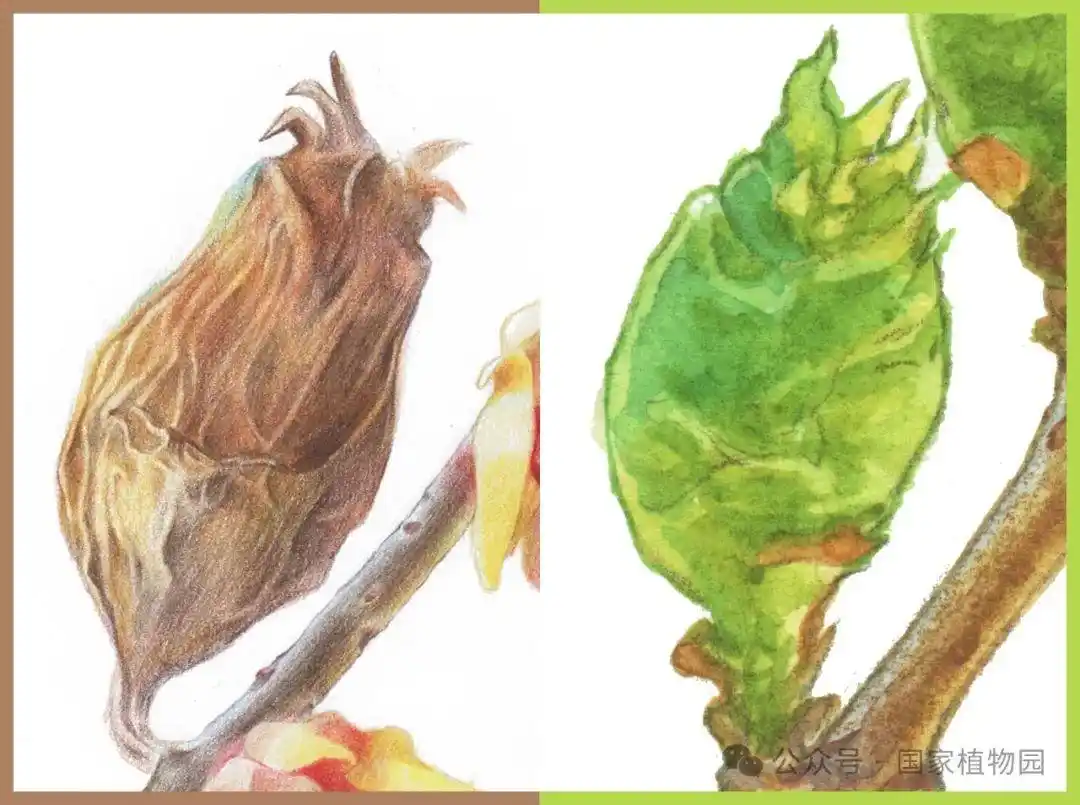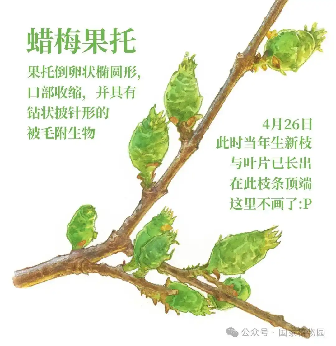 左:第四年3月古蜡梅开花时宿存的木质果托