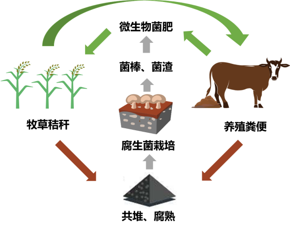 这套系统的运作过程就像一场精妙的 “生态接力”。首先,将秸秆和牛粪进行堆肥处理,为大球盖菇的生长提供基质。其次,大球盖菇化身高效的 “生态工匠”,在生长过程中充分发挥自己的 “分解能力”,将堆肥中的有机物质转化为自身所需的养分,从而实现食用菌的高效栽培。最后,培育大球盖菇的菌渣也没有被浪费,它摇身一变,成为了优质的肥料,重新被投放到农田中,为作物生长提供支持。
