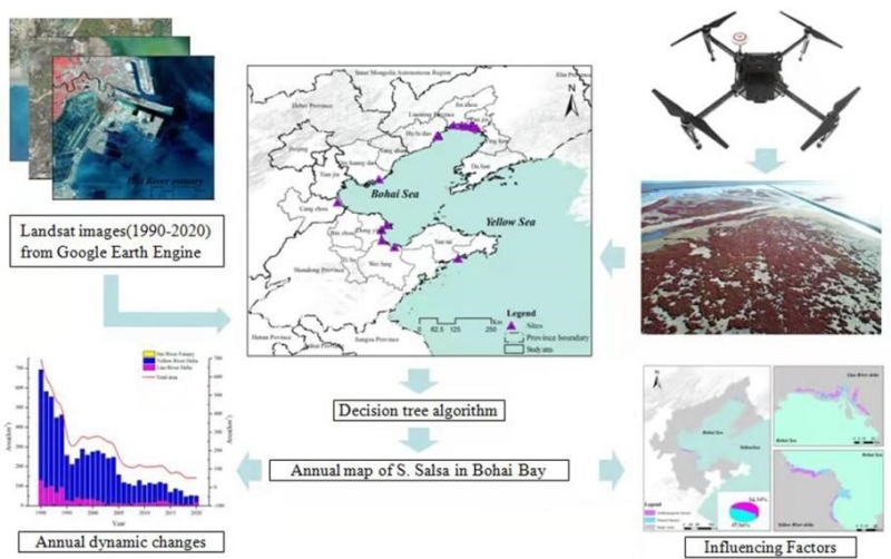上述成果以"Evolutions of 30-Year Spatio-Temporal Distribution and Influencing Factors of Suaeda salsa in Bohai Bay, China"和"Ecological and Environmental Effects of Estuarine Wetland Loss Using Keyhole and Landsat Data in Liao River Delta, China"为题发表在Remote Sensing 14(1), 2022和13(2), 2021上。中科院沈阳应用生态研究所景观生态组博士研究生尹红岩为第一作者,刘淼研究员和李春林副研究员为共同通讯作者。该研究得到了国家自然科学基金委重点项目、面上项目和重点研发等项目的支持。