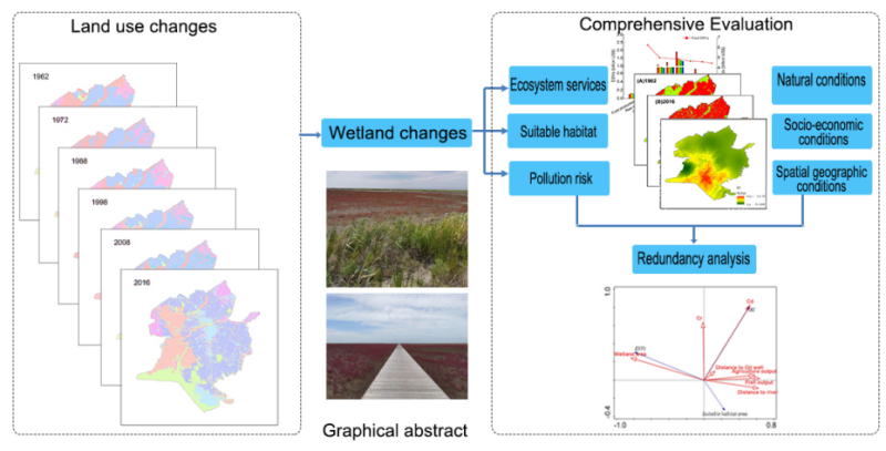 中科院沈阳生态所景观生态组以典型北方滨海湿地—环渤海区域为例,利用Landsat数据,首先利用谷歌地球引擎(GEE)解译得到1990-2020年连续30年典型滨海植被—盐地碱蓬空间分布结果。从人为因素和自然因素两个方面,利用主成分分析(PCA)和二元逻辑斯蒂回归模型(Binary logistic regression),对盐地碱蓬变化影响因素进行分析。并以典型滨海河口湿地—辽河三角洲为例,利用锁眼(Keyhole)和 Landsat数据,获得1962-2016年共6期辽河三角洲的土地利用数据,生态环境影响包括生态服务价值、鸟类生境适宜性、重金属的潜在生态风险三个方面。最后通过冗余分析对土地用利用变化、湿地流失及生态环境影响驱动力进行分析。