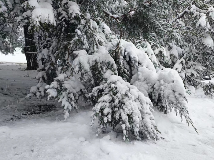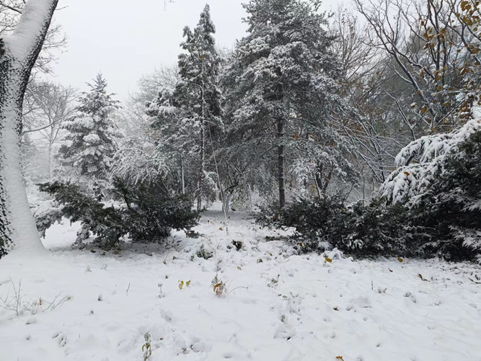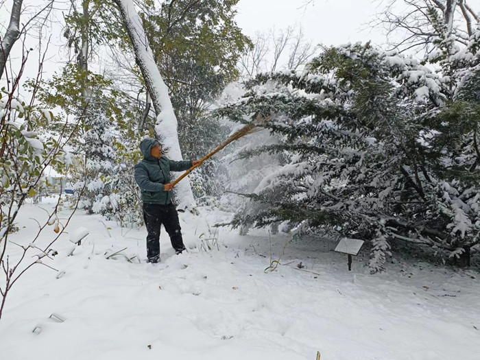 纷飞的大雪不断地堆积在园内常绿裸子植物上,有些植株已被压弯。而国家一级重点保护野生植物——东北红豆杉,它的下部枝叶已随着雪量的堆积,被深深地压向了地面,如不及时进行除雪,很有可能面临枝条折断的风险。