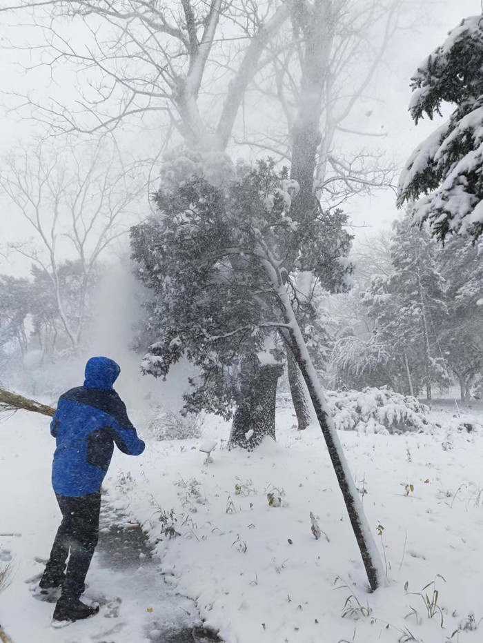 为了保护这些濒危植物,树木园的员工冒着大雪,用工具及时为它们清除枝叶上沉重的积雪,降低了它们在雪灾中受到伤害的风险。