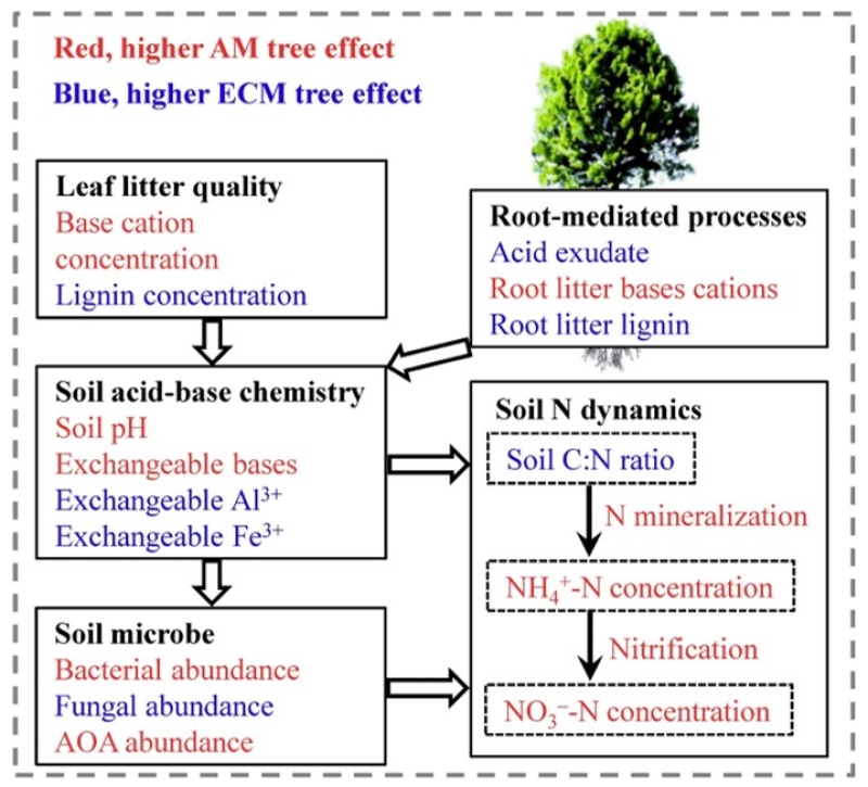 图2. 森林菌根类型调控土壤氮循环的“酸碱化学–微生物学”假说。红色和蓝色字体分别表示丛枝菌根森林和外生菌根森林具有较高的值