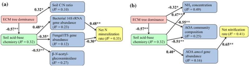 图3. 外生菌根树种优势度通过影响土壤酸碱化学性质和微生物生物量间接调控土壤氮转化速率