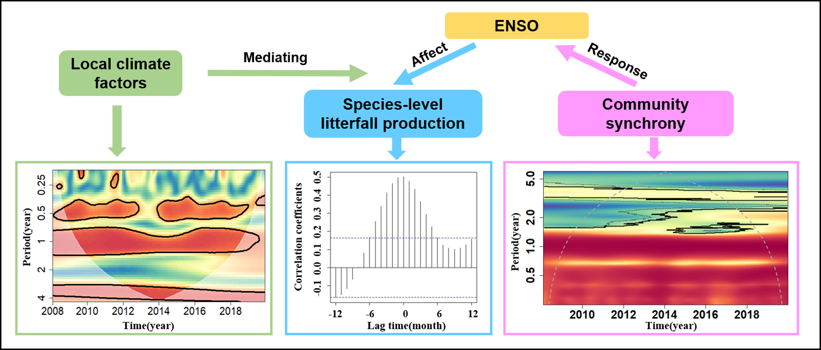 鉴于此,我室基于长白山25ha阔叶红松林样地12年间的262次凋落物收集数据,应用时间序列和小波分析方法探究了ENSO对温带森林物种水平种子及凋落叶产量的影响。研究发现:ENSO与长白山地区主要树种的种子及凋落叶产量均具有显著的相关性(r=0.206-0.258),尤其 ENSO指数对假色槭种子及凋落叶产量波动的解释力度达到了51%和45%。除此之外,研究首次发现了温带森林不同物种的凋落叶产量对ENSO的响应具有同步性;同时,种子产量季节同步性在厄尔尼诺发生的年份显著增强,但是在ENSO尺度上没有发现种子产量的同步性变化。局部气象因子的变化显著介导了ENSO对凋落物产量变异的影响,我们发现研究区的降雨和相对湿度分别介导了ENSO对水曲柳种子和紫椴种子的影响。此研究进一步证实了ENSO对温带森林的调控作用,为今后进一步了解温带森林对全球变化的响应提供了有利的支撑。