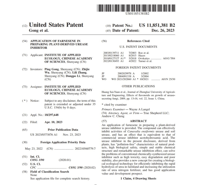 我组“土肥水高效利用与绿色肥料创新”大团队植物营养与肥料组通过多年研究,从天然植物中提取、筛选,最终获得了高效的植物源脲酶抑制剂-金合欢烯,该抑制剂在微宇宙试验中,可显著抑制土壤脲酶活性,减缓尿素水解速率,提高氮素利用率。基于该抑制剂前期授权了中国发明专利,经过多轮答辩,近日获得美国授权发明专利,该成果为我国首次取得知识产权保护的植物源脲酶抑制剂美国专利授权。填补了我国在植物源抑制剂研究领域的空白,丰富了抑制剂材料库,进一步提升了我所在新型肥料领域的国际竞争力,为研发新型绿色稳定性肥料提供了强有力的技术支撑。